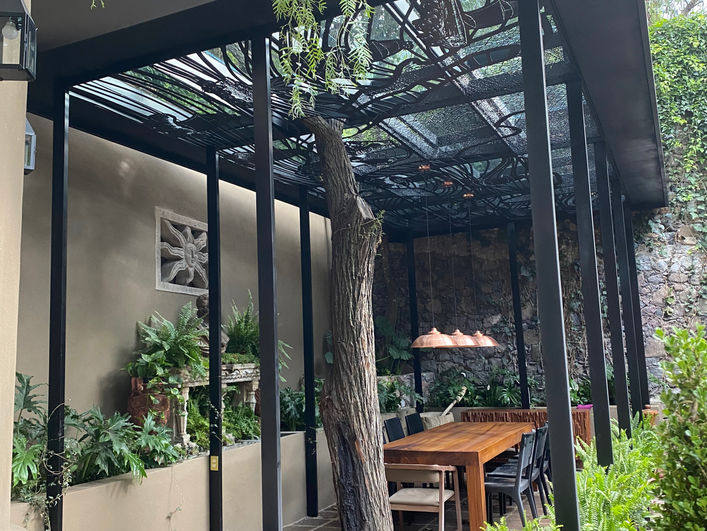 Casa Baeza, ubicada en San Miguel de Allende, se convirtió en un lienzo de colaboración entre la arquitectura, el arte y la herrería de autor. Eduardo diseñó e intervino un pabellón escultórico de gran formato en acero al carbón y cristal EVA, integrando un plafón del Maestro Emiliano Gironella. Su obra incluyó mobiliario, herrería artística y la curaduría de arte, en un ejercicio donde cada pieza instalada o restaurada mantiene un diálogo entre lo estructural y lo simbólico.